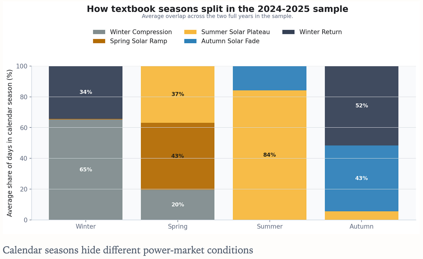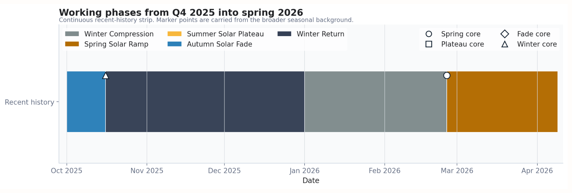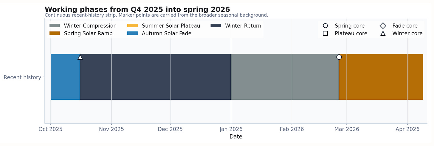 A market-season vocabulary helps to identify the path more clearly than calendar seasons alone. In this report window, the useful sequence is Autumn Solar Fade, Winter Return, Winter Compression, and Spring Solar Ramp.