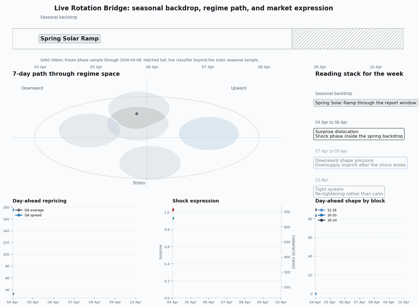 Some of the setup was visible before Monday. By 2026-04-03, the classifier had already shifted into Surprise dislocation regime. By 2026-04-05, DA average was at EUR -16.34/MWh, and the 12-16 block had already turned sharply negative. A soft holiday midday was already in the day-ahead structure.