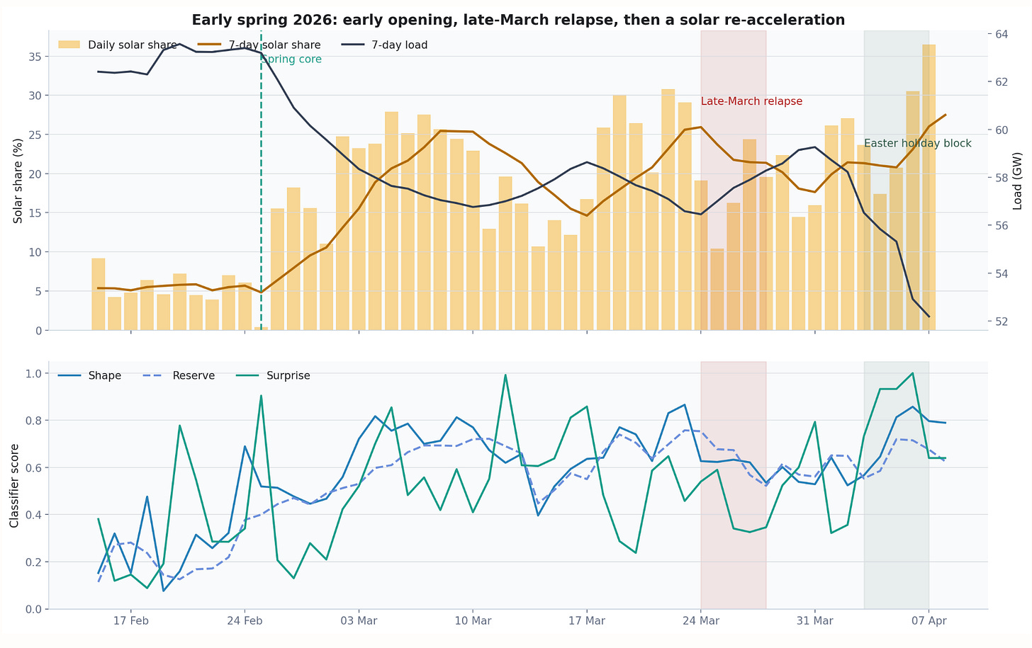 Three parts of that spring turn matter here. After 2026-02-25, solar moved into a higher operating range and stayed there much more often than in winter. Late March then wobbled without fully resetting the spring pattern: solar eased, load firmed, but the score layer stayed active instead of dropping back to the quieter early-February read. The Easter block belongs inside that same setting. Spring already looks like its own operating environment rather than a brief transition out of winter.