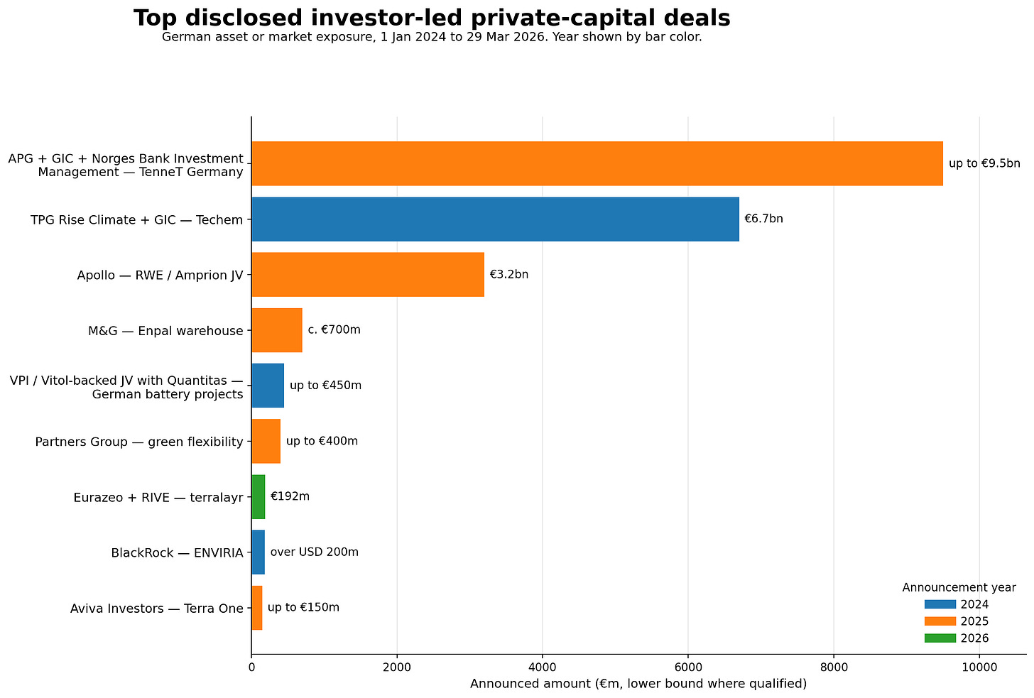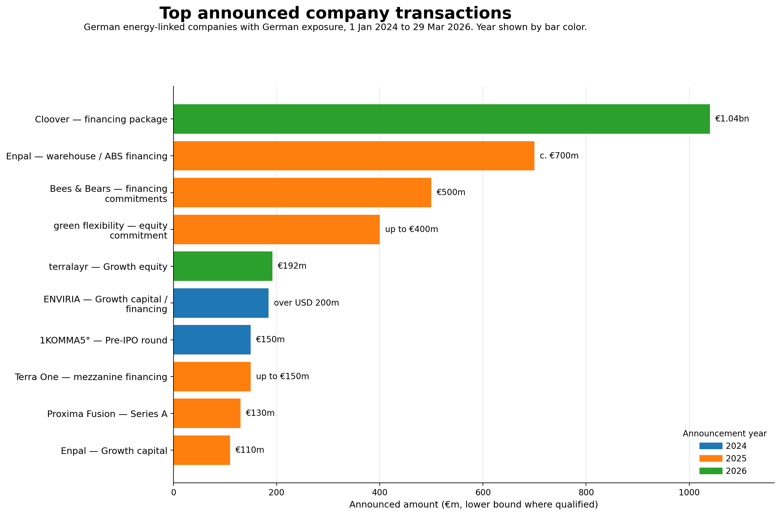 A review of publicly announced energy-linked transactions with German exposure from 1 January 2024 to 29 March 2026. Estimates, comparisons, analysis based on publicly available data.