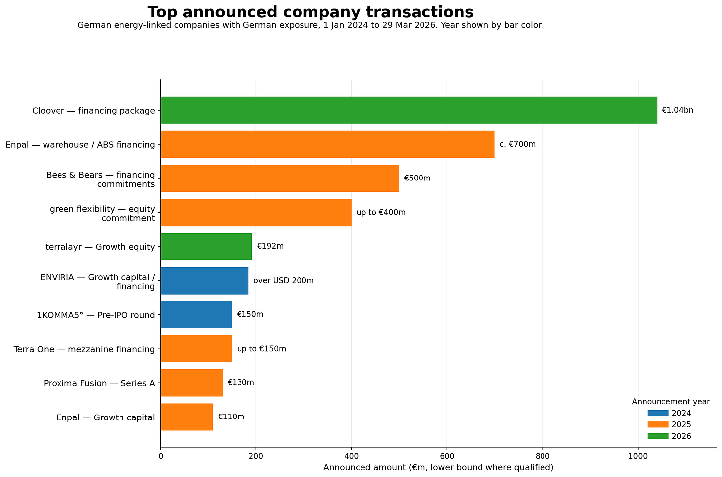 Which companies in the German energy-linked space announced the biggest capital events? Let’s focus on the biggest company-level announced transactions in the dataset from the perspective of the company raising or receiving capital. For an overall view, we’ll mix things like: equity rounds, mezzanine, (ABS) warehouses, debt facilities, financing commitments.