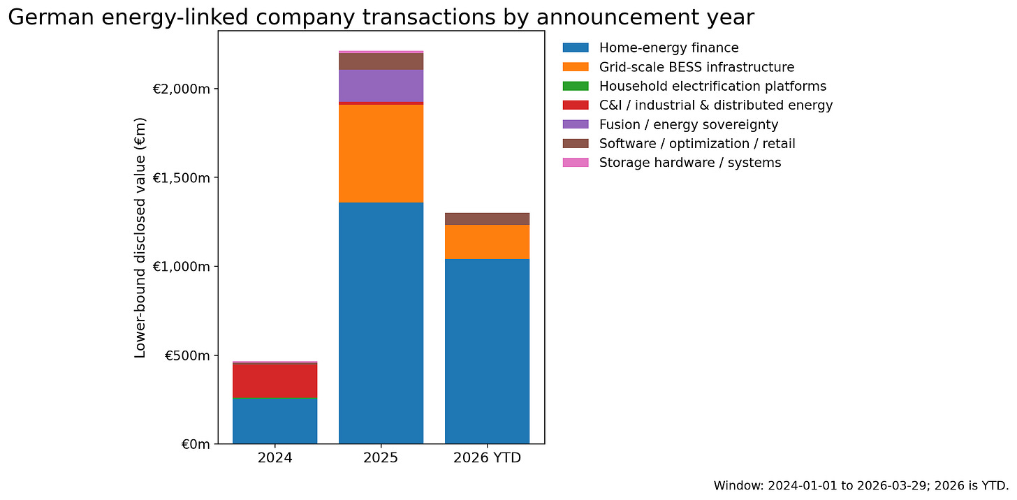 This review captures 27 company-announced transactions worth €3.98 billion on a lower-bound basis, alongside 14 investor-led private-capital entries, of which 9 disclosed or bounded amounts totalling €21.48 billion. The company-side sample is small in 2024, 6 deals worth €466 million, before broadening sharply in 2025 to 16 deals worth €2.21 billion, with 2026 year-to-date already at €1.30 billion across 5 deals. That progression is part of the story: the larger capital-formation layer of the Energiewende becomes much more visible only later in the sample, especially as household-electrification finance, battery platforms, and grid-linked capital start to scale.