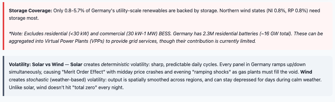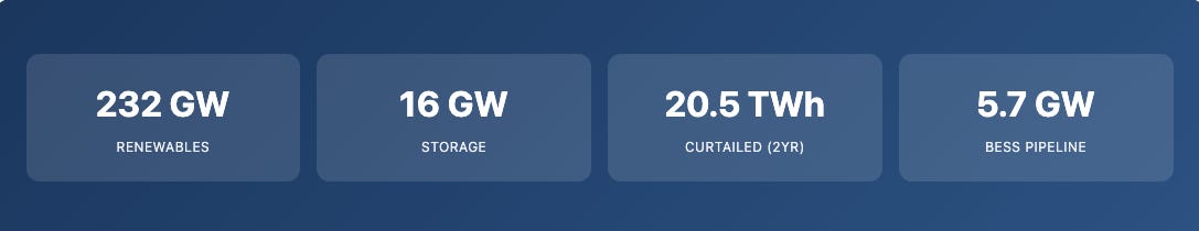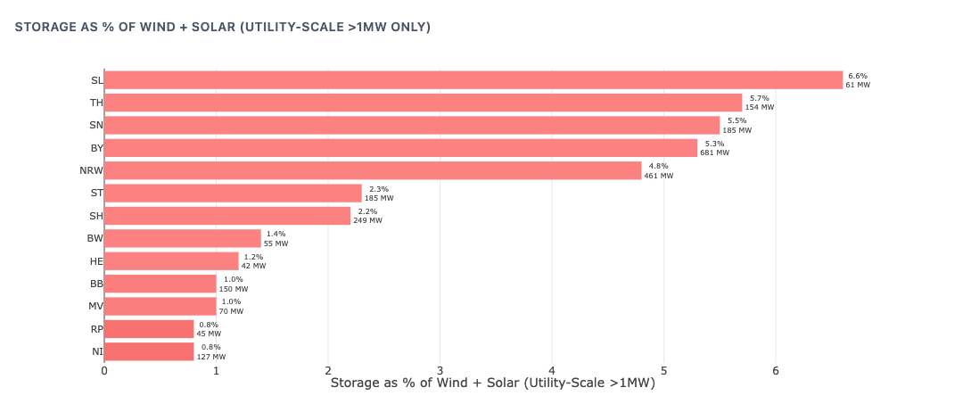 Storage gap — only 0.8-5.7% of renewables backed by storage; grid-scale BESS (>10 MW) is just 1.6 GW