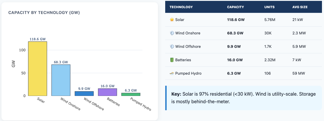 Geographic mismatch — wind clusters north (NI 14 GW), solar dominates south (BY 29 GW), transmission limited to ~10 GW