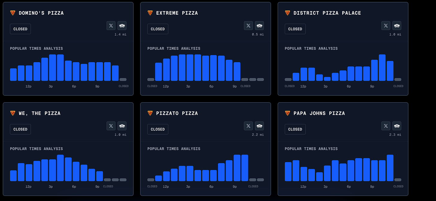 Have you heard of the Pizza Index? It tracks the intensity of pizza delivery demand near the Pentagon. The idea is that when the Pentagon moves into crisis operation mode, more overnight pizzas are ordered by staff.