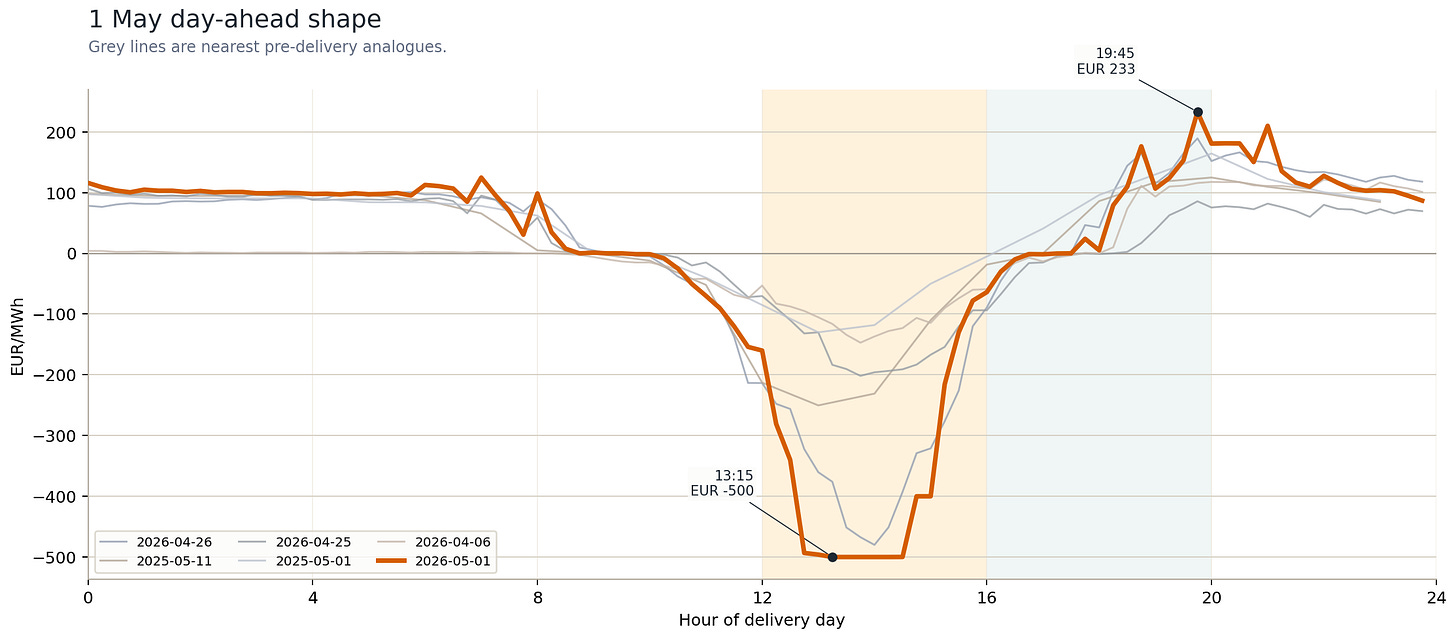 The day-ahead average is EUR -2.08/MWh, but that’s probably the least interesting number here. The DA low is EUR -499.99/MWh, the high is EUR 232.99/MWh, for a high-low spread at EUR 732.98/MWh. The 12-16 block averages roughly EUR -374.61/MWh. By 16-20, the curve has recovered to about EUR 56.51/MWh.