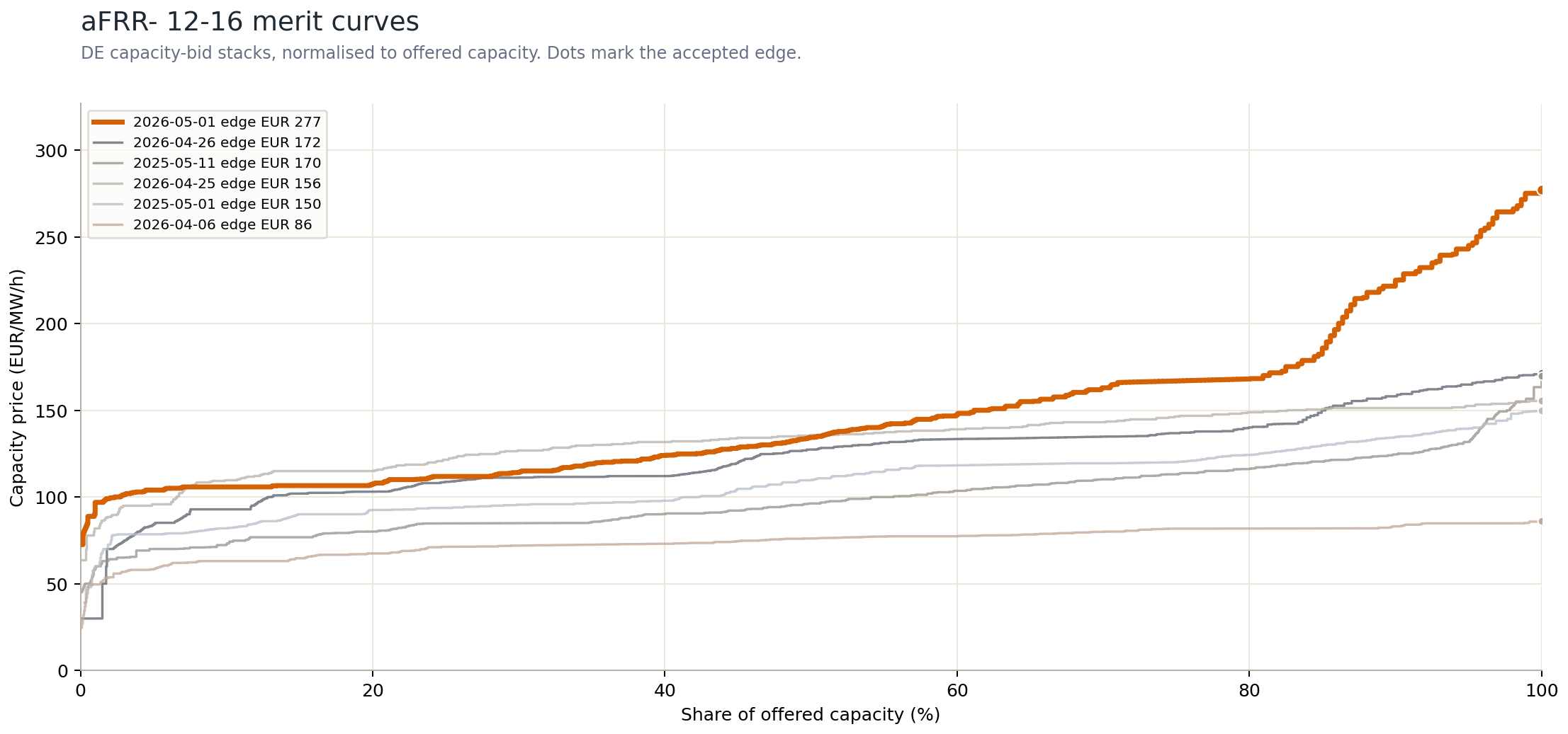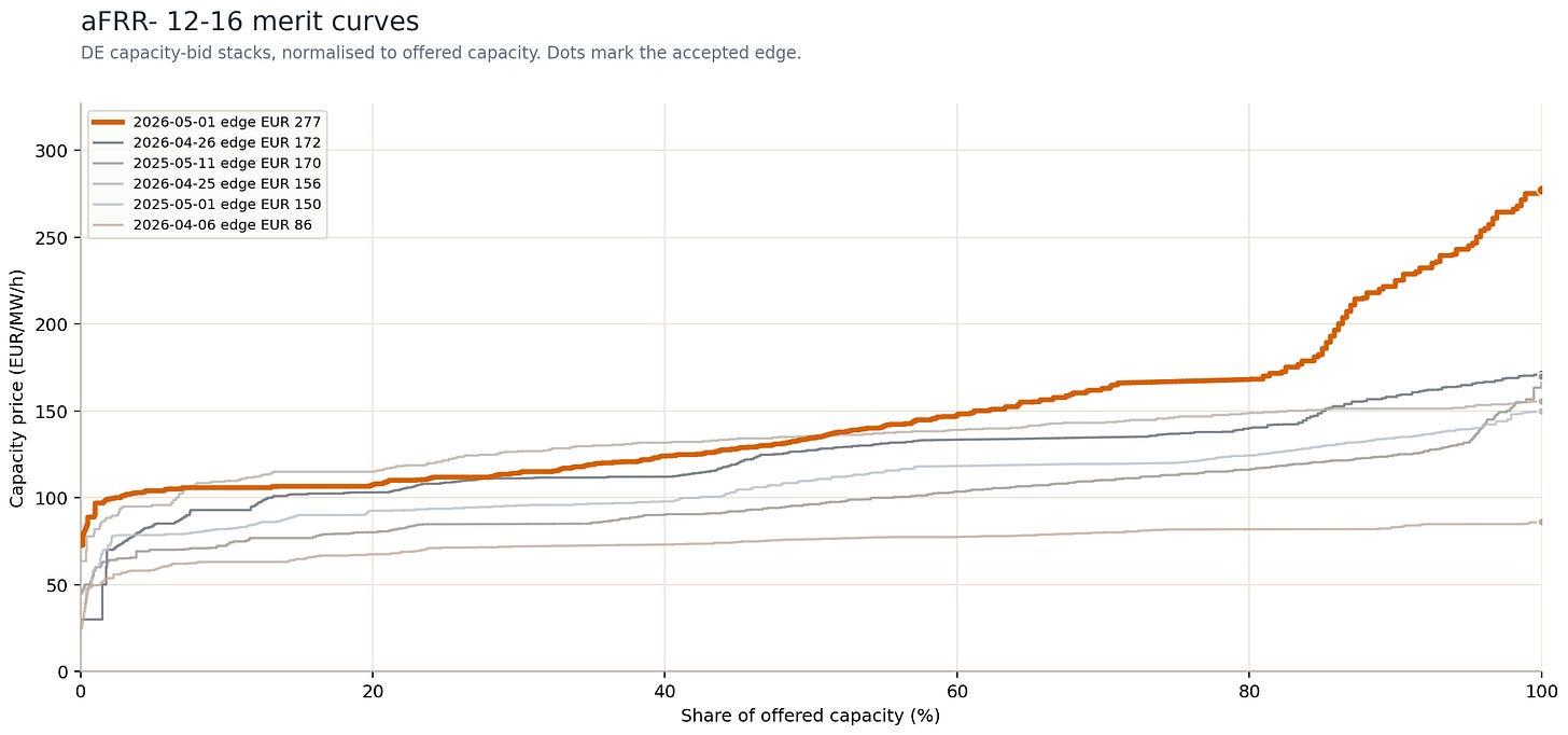 FCR 12-16 is EUR 442.90/MW/4h. aFRR- 12-16 is at an average of EUR 146.72/MW/h, with the last accepted bid at EUR 277.23/MW/h. Mind the widening gap. mFRR- 12-16 is also high at EUR 229.81/MW/h, while positive evening reserve is as muted as you’d expect: aFRR+ 16-20 at EUR 10.31/MW/h.