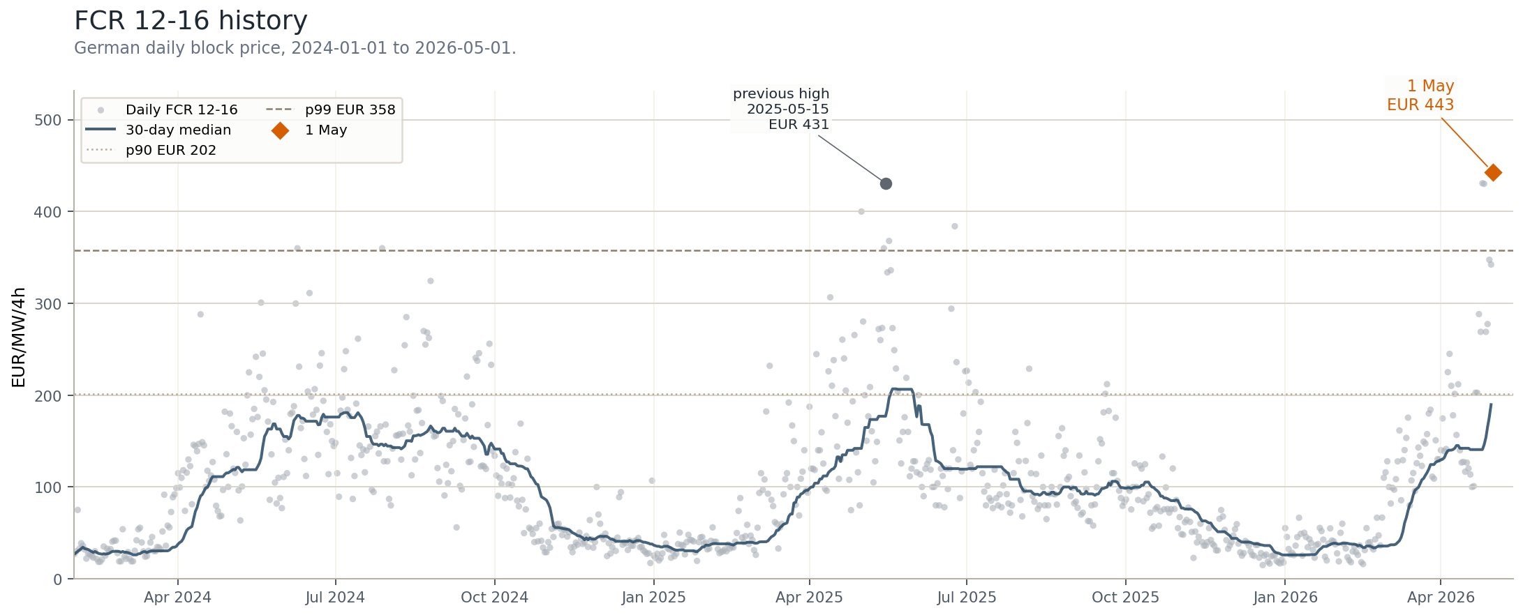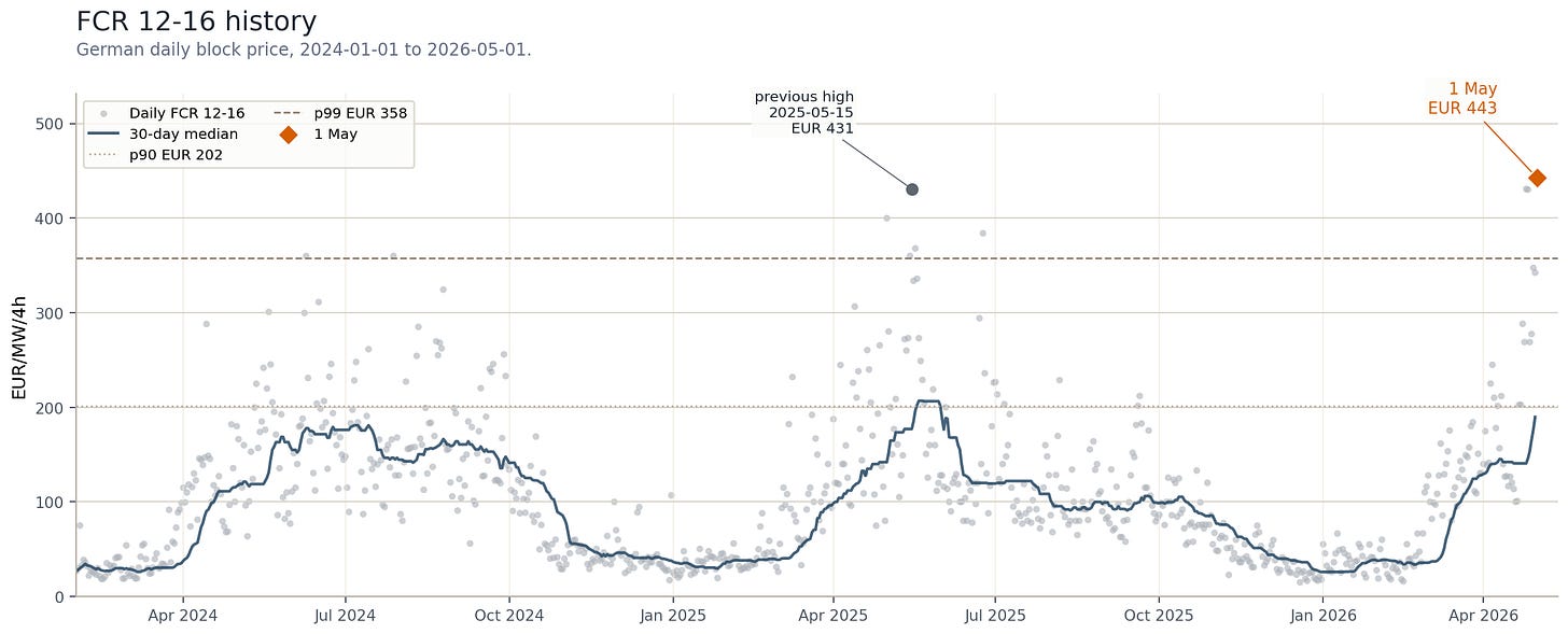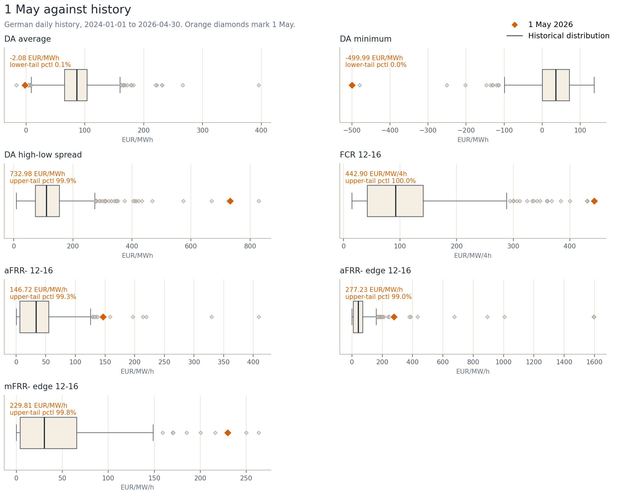 1 May is not just low on one dimension. Action in several tails at once from a low DA centre: deep DA lower tail, very wide DA spread, high FCR, high aFRR- and high mFRR- around the same midday/downward-flexibility window. Did I hear someone say the FCR action is over?