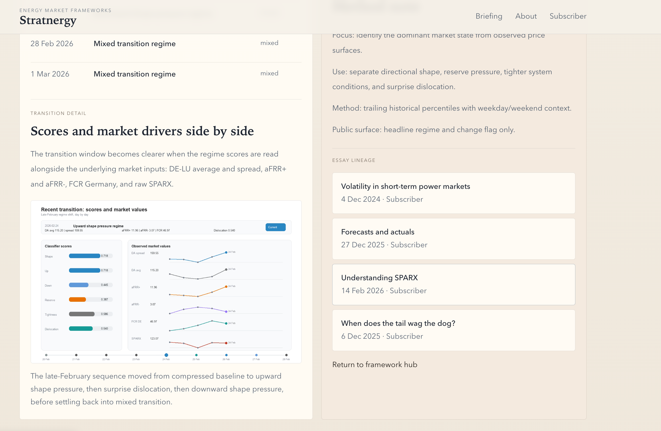 If day-ahead spread is EUR 114/MWh, is that unusual? If aFRR- is elevated, is that a one-off block effect or part of a broader reserve-pressure state? If FCR is high but day-ahead is not, are we seeing underlying system tightness or narrower reserve strain?