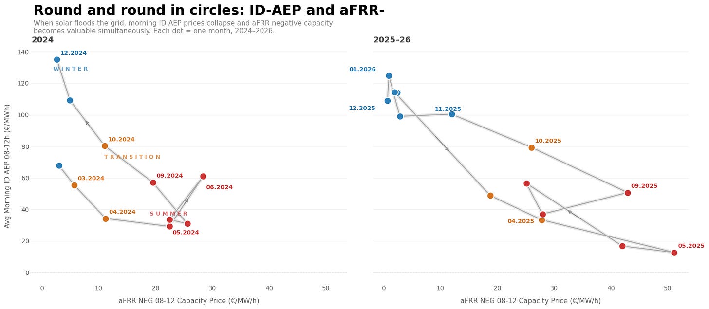 Start with the inverse relationship that runs like clockwork every year: when the aFRR NEG 08-12 capacity price is high, ID prices are low. When aFRR capacity is cheap, ID prices sit higher. Both link to solar generation intensity. When the sun is strong, the grid needs downward flexibility in the morning hours, which makes negative aFRR capacity valuable and suppresses spot prices simultaneously.